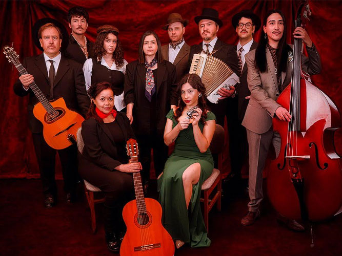 La banda presenta «Puerto Amores», un concierto teatralizado que mezcla patrimonio musical chileno y composiciones propias para contar una cautivante historia de amor. Con músicos y actores en escena, el relato viaja entre foxtrot criollo, swing, boleros, cueca y valses porteños de un Chile antiguo.